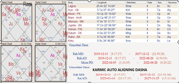 Rahu operates through its dispositor Venus, placed in Lagna in Ashwini Nakshatra—a healer, yet impulsive. Hence, the native runs directionless at times, making relational mistakes. Over time, Rahu purifies the soul, especially as both Rahu and Sun occupy Krittika Nakshatra (ruled by Sun—the natural AK).